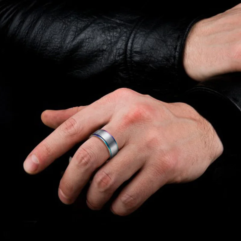 Sale Men Rings Silver Tone Brushed Center With Rainbow Rim 8MM Wedding Band Crafted Stainless Steel Male