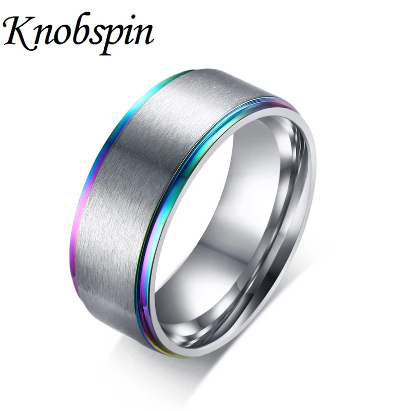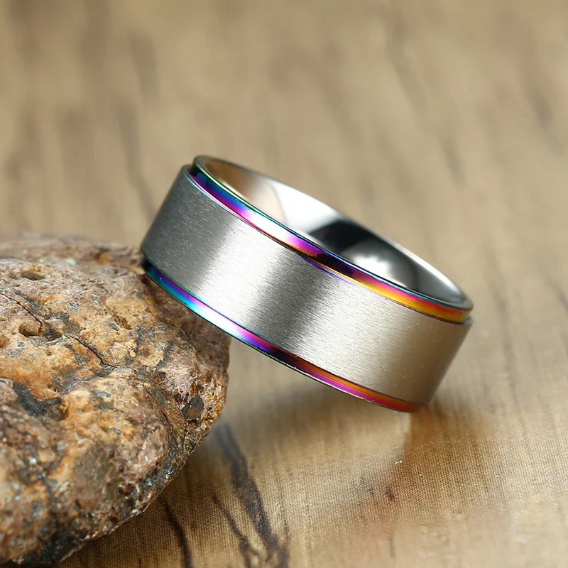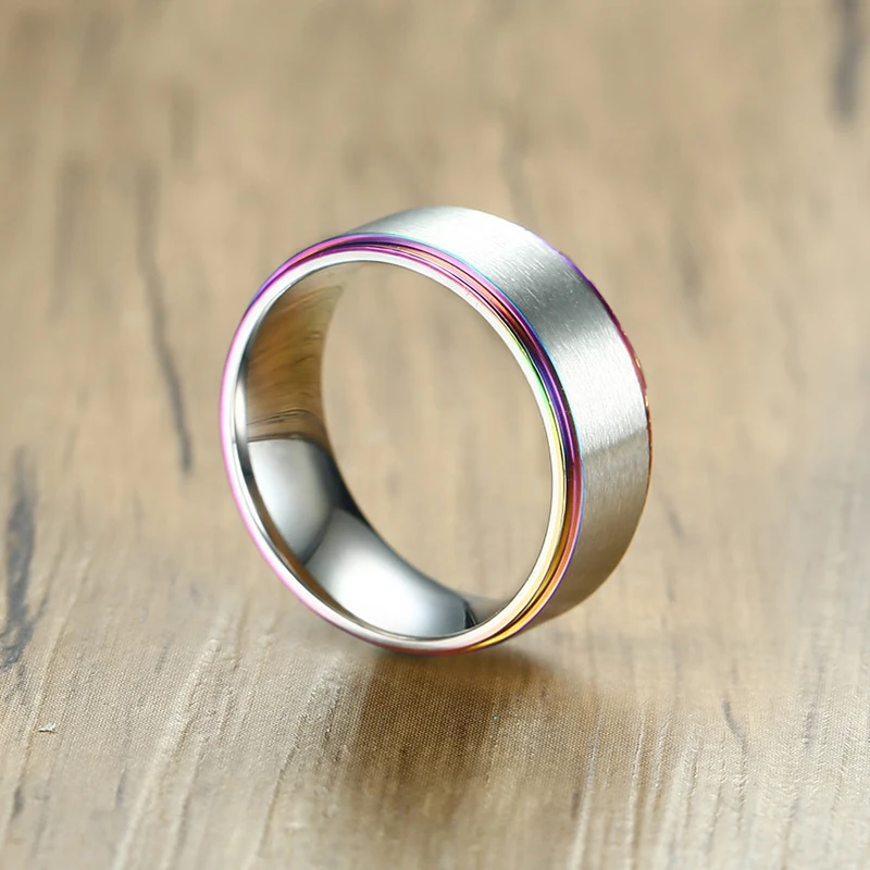 Purchase Men Ring Silver Tone Brushed Center With Rainbow Rim And Comfort Fit 8MM Wedding Band Crafted 316L